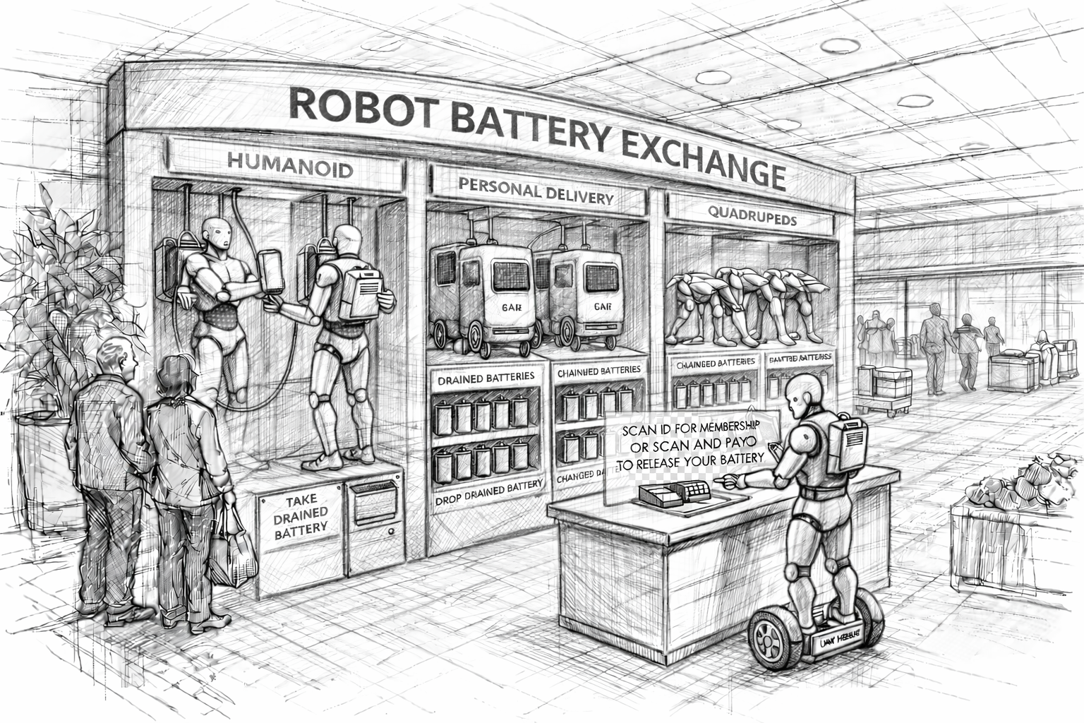 There could be separate sections for humanoids, personal delivery robots, and quadrupeds or it could be organized by top brands, if the same batteries work across all models from the same producer. Each section would contain the battery formats that work with those systems. A robot would arrive, scan in its credentials to confirm it is part of the program or register as a guest and put a card on file and go to the correct exchange point for its class.